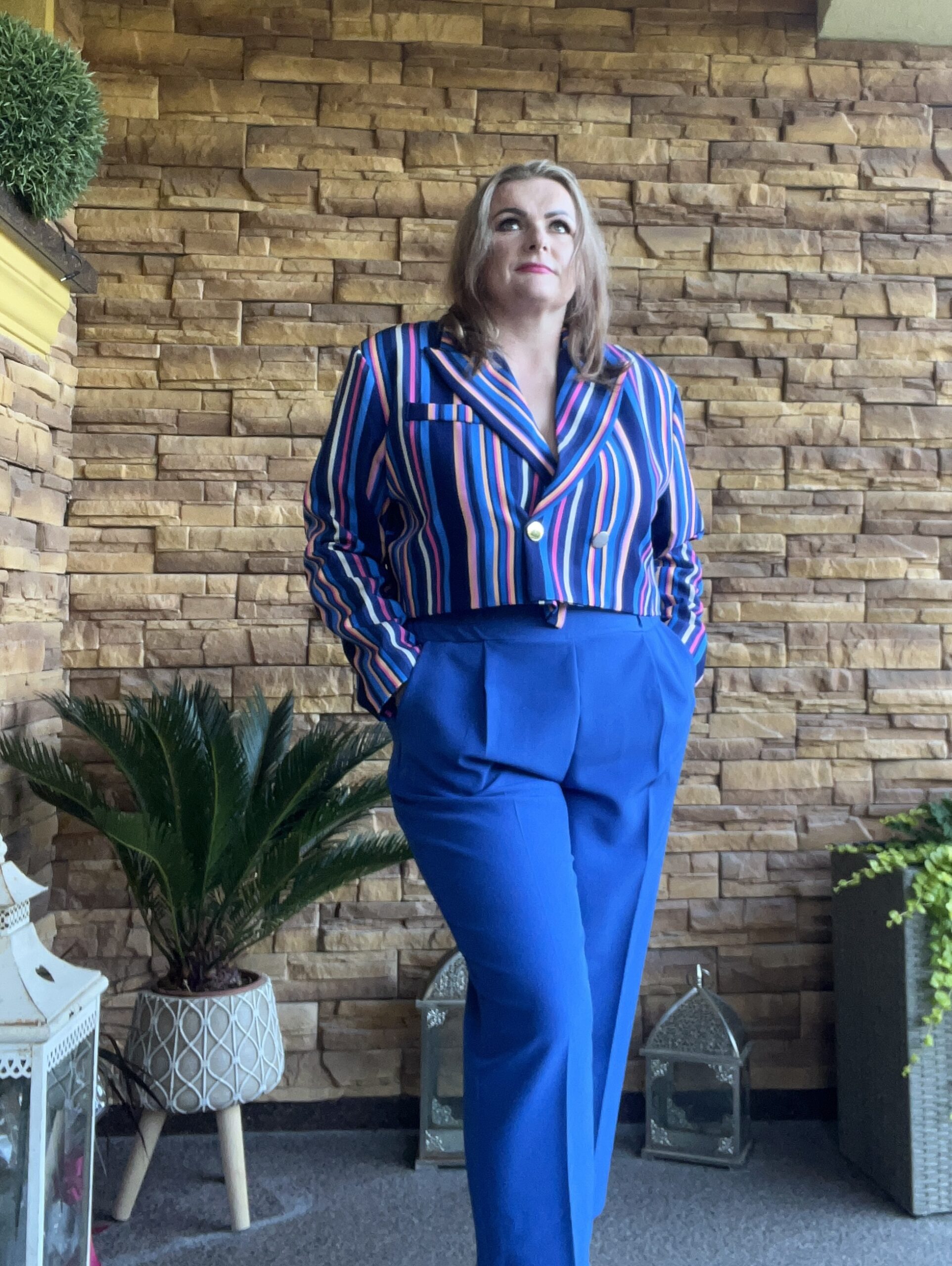Wyrazisty komplet w paski z krótszą marynarką i spodniami z wysokim stanem to świetna propozycja dla kobiet, które lubią bawić się modą.